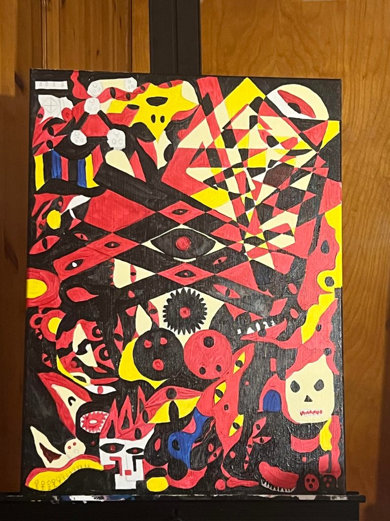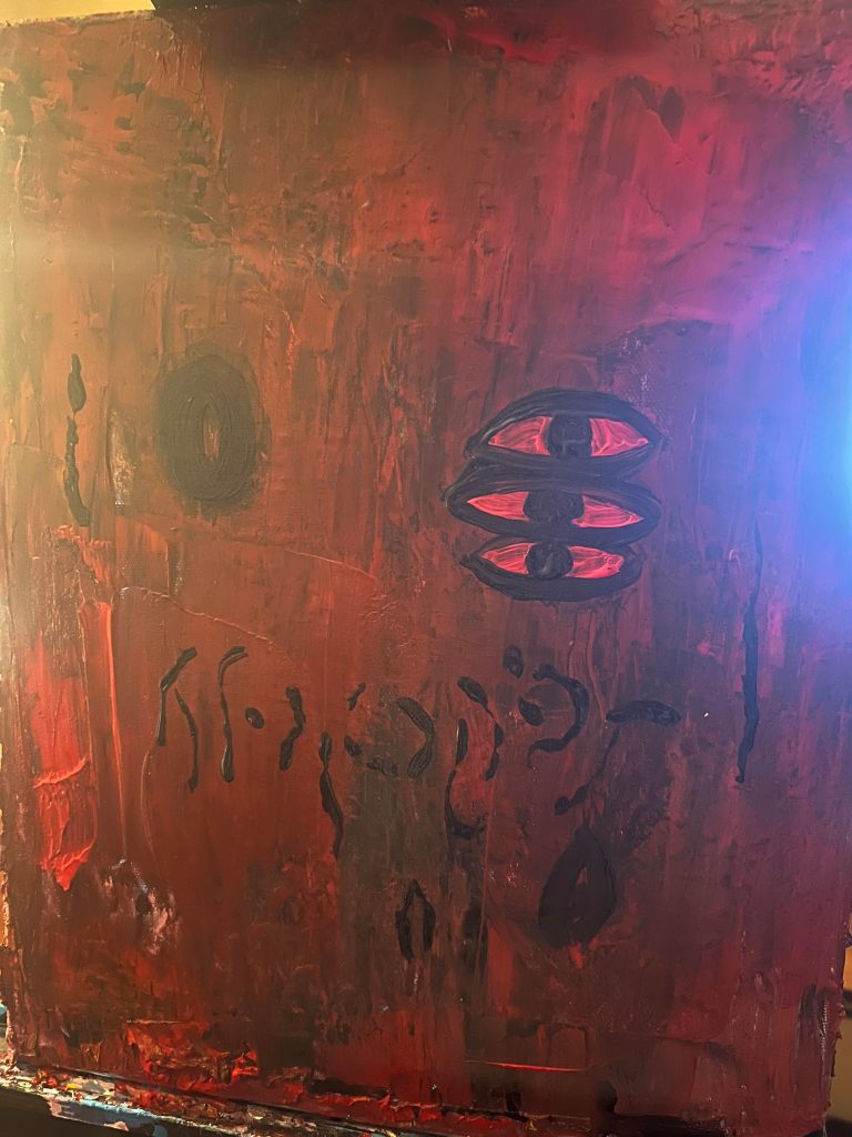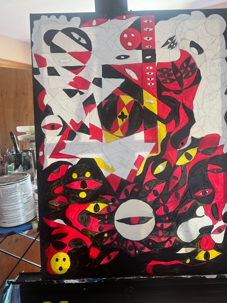Currently working on a new body of work as I document my current exhibition: Conflict: Self and the World. It’s fun and interesting to see my work evolve in such a way. I took one of my style — geometric mixed with freehand drawing– and have touched it up a notch by applying mostly free hand. I am also dealing with darker colors this time around and shortening my list of colors (we shall see how long that lasts). But before I really delved into the abstract shapes, I got back into painting with an OG palette knife approach. But I do see the eyes coming as “focal points” for both.